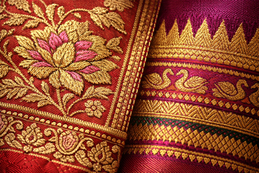 Banarasi silk sarees originate from Varanasi (Banaras), Uttar Pradesh, one of the world’s oldest living cities. Influenced heavily by Mughal art, Banarasi sarees are known for their intricate detailing and poetic elegance.